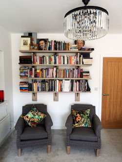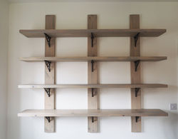 ![]() 6ft shelving unit with cast iron brackets. | ![]() Shelving unit | ![]() Bespoke T.V unit. |